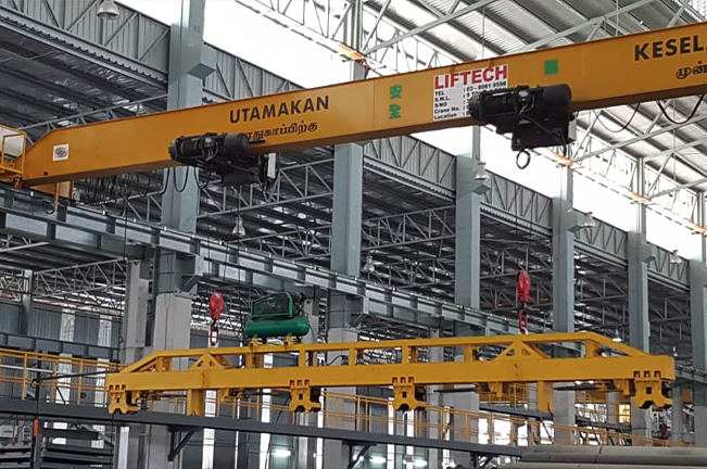 Our cranes come with a bridge that moves along a set path, with a hoist that goes up, down, and sideways, mainly used in factories to lift heavy items. Our overhead crane in Malaysia can have one (single girder) or two bridges (double girder), depending on the crane’s need.